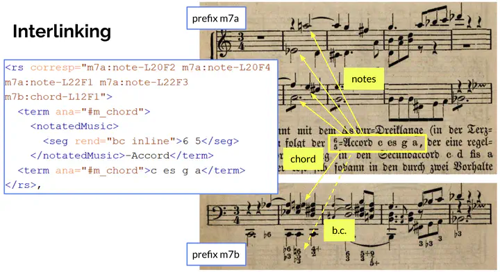 It has been demonstrated that text-music-linking can operate very effectively on a presentational level for text that repeatedly and explicitly refers to sections of a piece of music in standard notation.[1] Yet, another challenge for digital encoding are symbols for harmonic or other analyses that are idiosyncratic to only one or a few sources but not common enough to be considered by current music encoding standards and guidelines. This tightly-knit texture of musical and textual interdependence renders music-theoretical treatises a prime case study for digital encodings of documents that partake in both domains. A successful multimodal encoding with effective bidirectional interlinking (music to text and text to music) would moreover facilitate subsequent computational analyses, such as querying for specific terms and concepts or named-entity recognition across documents.