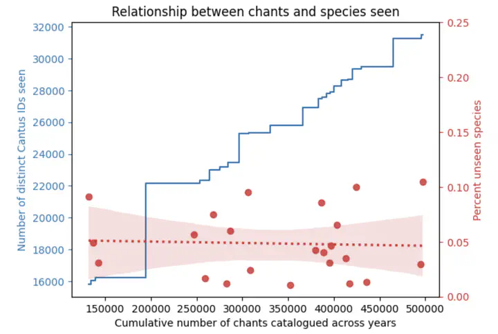A major locus of musicological activity—increasingly in the digital domain—is the cataloguing of sources, which requires large-scale and long-lasting research collaborations. Yet, despite decades of effort, the databases aiming at covering and representing musical repertoires are never quite complete, and scholars must contend with the question: how much are we still missing? This question structurally resembles the ‘unseen species’ problem in ecology, where the true number of species must be estimated from limited observations. In this case study, we apply for the first time the common Chao1 estimator to music, specifically to Gregorian chant. We find that, overall, upper bounds for repertoire coverage of the major chant genres range between 50 and 80%. As expected, we find that Mass Propers are covered better than the Divine Office, though not overwhelmingly so. However, the accumulation curve suggests that those bounds are not tight: we find that ∼5% of chants in sources indexed between 1993 and 2020 were unique, so dimin- ishing returns in terms of repertoire diversity are not yet to be expected. Our study demonstrates that these kinds of questions can be addressed empirically to inform musicological data-gathering, and delineate promising areas of application for unseen species models in musicology.
