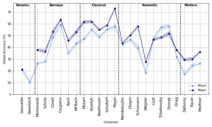 This study focuses on the exploration of the possibilities arising from the application of an NLP word-embedding method (Word2Vec) to a large corpus of musical chord sequences, spanning multiple musical periods. First, we analyse the clustering of the embedded vectors produced by Word2Vec in order to probe its ability to learn common musical patterns. We then implement an LSTM-based neural network which takes these vectors as input with the goal of predicting a chord given its surrounding context in a chord sequence. We use the variability in prediction accuracy to quantify the stylistic differences among various composers in order to detect idiomatic uses of some chords by some composers. The historical breadth of the corpus used allows us to draw some conclusions about broader patterns of changing chord usage across musical periods from Renaissance to Modernity.